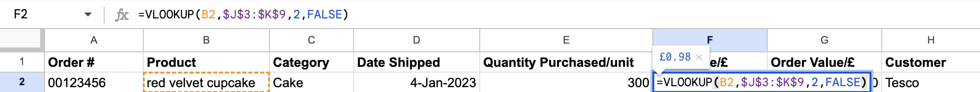 For our second example, let’s imagine our bakery company wants to add a bit more detail to their spreadsheet. They have the quantity of each order, but not the value. Rather than going down and working each one out, for each individual product, they can do a VLOOKUP to automatically work out the value of each order, based on the price of the product that has been ordered.